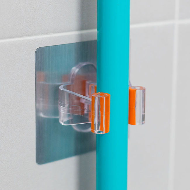 Colgador para escobas, fregonas y mopas en acabado metálico. En la parte posterior, dispone de un resistente adhesivo industrial que facilita su instalación, sin necesidad de utilizar tornillos. Apto para todo tipo de superficies, como azulejos, vidrios, piedra, maderas, etc. Debido a su alta resistencia al agua, la humedad o el aceite, es ideal para colocar en cocinas y cuartos de baño. Para su utilización, recomendamos esperar 24 horas desde su instalación para una mayor fijación. Soporta 5 kgs de peso.