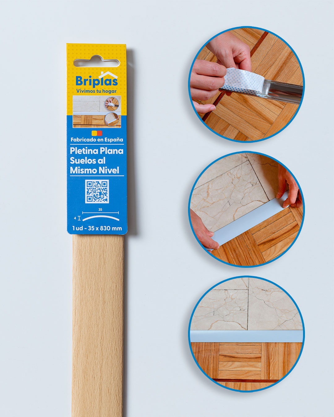 Pletina de alta calidad, para la unión de suelos al mismo nivel. Fabricado en material resistente. Fijación adhesiva y fácil de instalar en todo tipo de suelos.